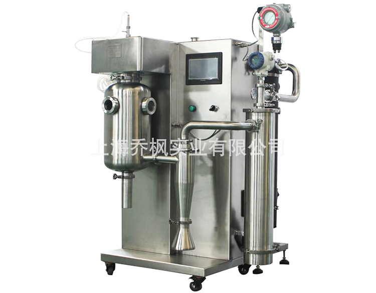實驗室小型噴霧干燥機是快速干燥液態物料的一種干燥設備,在干燥室中將液體物料經霧化后,在與熱空氣的接觸中,水分瞬間汽化,即得到干燥產品,該法能直接使溶液、乳濁液干燥成粉狀或顆粒狀制品,可省去蒸發、濃縮、粉碎等工序,且得到的顆粒分布均勻。實驗室小型噴霧干燥機具有傳熱快,水分蒸發迅速,干燥時間瞬間的特點,且制品質量好,溶解性能也好,能改善某些制劑的溶出速率。
