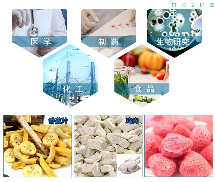 凍干制品成海綿狀、無干縮、復水性極好、含水分極少,相應包裝后可在常溫下長時間保存和運輸。 由于冷凍式干燥機具有其它干燥方法無可比擬的優點,因此該技術問世以來越來越受到人們的青睞,在醫藥、生物制品和食品方面的應用已日益廣泛。血清、菌種、中西醫藥等生物制品多為一些生物活性物質,冷凍干燥技術也為保存生物活性提供了良好的解決途徑。